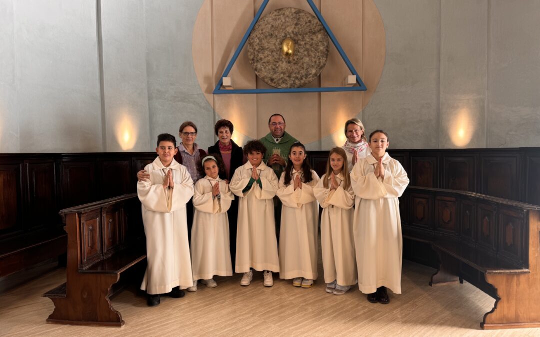 6 ragazzi e ragazze che hanno ricevuto la Prima Comunione in ottobre, si prestano per offrire il loro servizio all’altare durante l’Eucarestia.